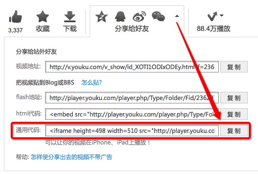 知校已经支持站外视频分享啦(目前已支持优酷、土豆、新浪、搜狐、腾讯等主流视频网站),请跟着我们一步步学习视频分享吧: 1. 以优酷视频为例,第一步先进入优酷官网(http://www.youku.com) ,找到对应的视频并播放; 2. 观察播放窗口下面有一项【分享给好友】,点击右边下拉箭头展开: 3. 此时点击如图所示的【通用代码】行右侧“复制”,将信息复制到剪贴板; 4. 返回知校平台,在发布信息时,点开【视频分享】按钮,将地址粘贴并确认。 通过以上步骤即可分享站外视频啦,是不是很简单呢?O(∩_∩)O~ |